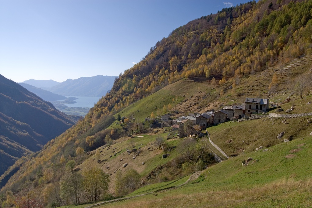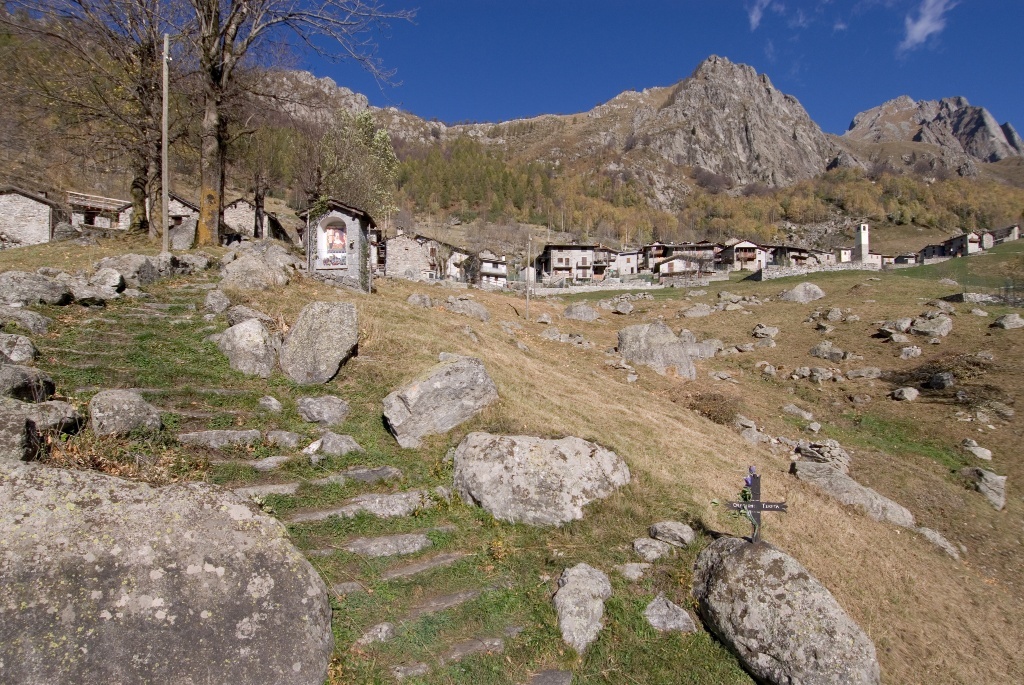 Wer Lust hat, kann die Wanderung noch weiter fortsetzen, was drei Stunden in Anspruch nimmt. Wir gehen in Richtung Corveggia und folgen kleinen Straßen und Wegen, die durch die Dörfer Tabiate (1253 m), Camerate (1792 m) und Talamucca (2100 m) führen. Nachdem wir die ausgedehnten Weiden durchquert haben, kommen wir zu einem weiten Gletscheramphitheater, in dem sich die Capanna Volta majestätisch erhebt. Der Ort ist von spektakulären Gipfeln umgeben: vor allem der Peilstein (2888 m) und der Pizzo Ligoncio (3033 m).