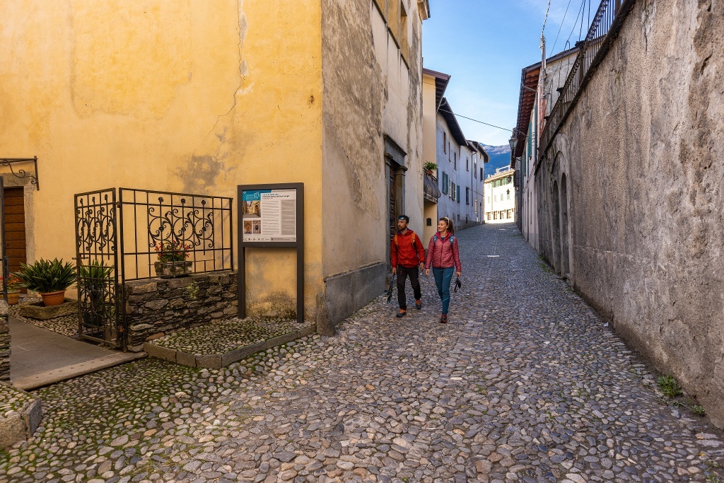 From Sondrio, through the charming historic district of Scarpatetti, you ascend to Castel Masegra and the hamlet of Ponchiera; from here the route winds along the terraces crossing in Montagna in Valtellina the church of Madonna di Caravaggio and the church of Madonna del Carmine until reaching Poggiridenti with the church of the Blessed Virgin of Good Counsel. After another three kilometers, you arrive in Tresivio, in one of the most important sacred buildings in the province of Sondrio, the majestic Sanctuary of the Holy House, which stands out from all other Baroque churches in Valtellina for its size and for the facade and sides articulated by a double order of niches. Inside, the holy little house of the Virgin (temple within a temple) and the wooden statue of the Black Madonna replicate the layout of the famous sanctuary of Loreto. The stage continues, offering enchanting views until reaching Ponte in Valtellina, one of the most picturesque villages in the valley, and the church of the Blessed Virgin of Good Counsel, whose facade is so simple it blends with the nearby houses. Leaving Ponte in Valtellina, the route climbs to Teglio, another splendid village and the homeland of pizzoccheri. After passing the church of Santa Maria di Ligone, of medieval origin and a destination for processions during the solemn festivals of the Madonna, you reach the Parish Church of Santa Eufemia, the final point of the stage and of ancient foundation.