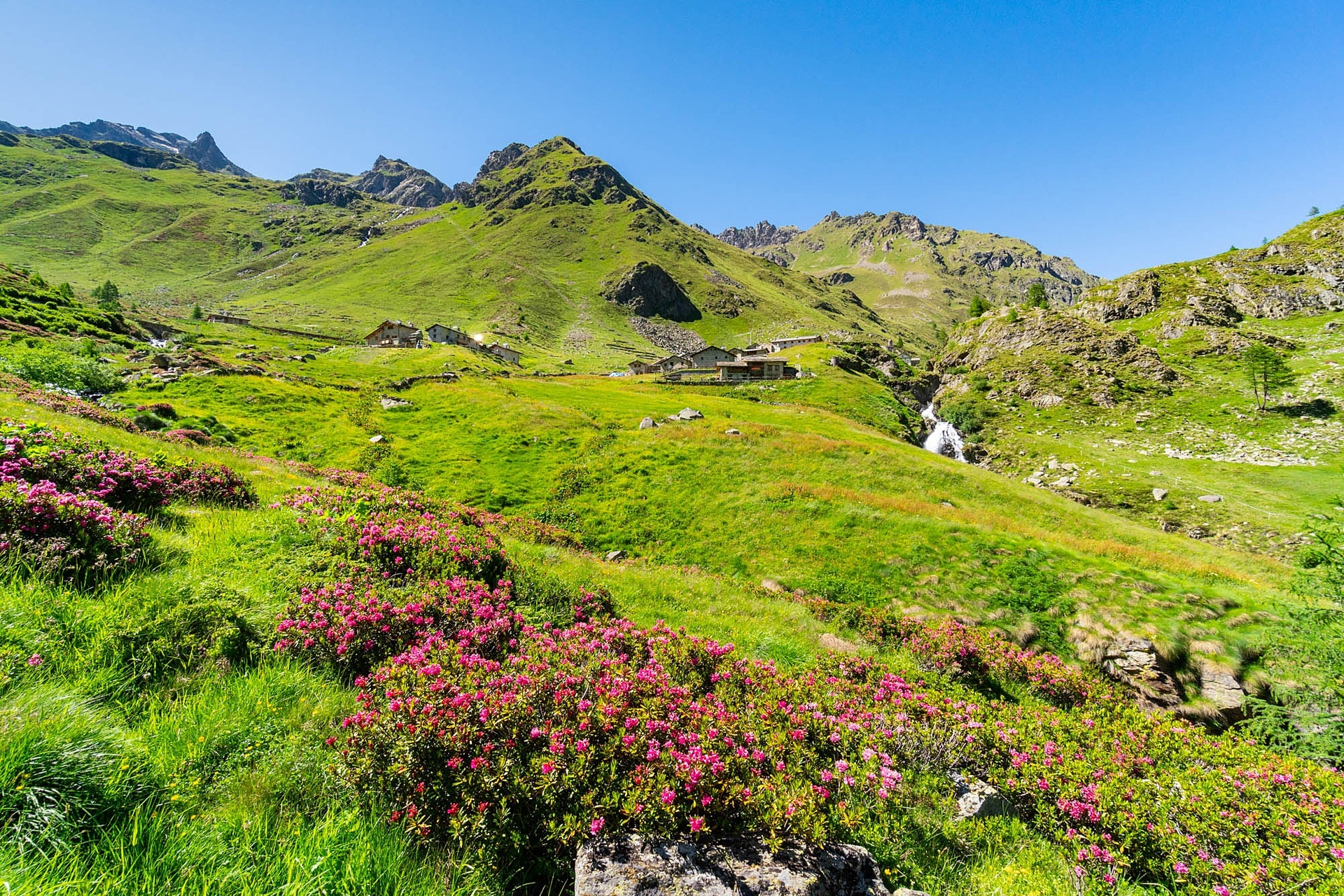 Dai versanti che dominano la Valtellina ci si sposta nell’isolata Val Grosina con una tappa di media lunghezza e dislivello ridotto. Dal Rifugio Schiazzera seguendo la Mulattiera Militare della I Guerra Mondiale si sale al freddissimo Lago Schiazzera sempre seguendo la Mulattiera si prosegue verso est in leggera discesa passando per Alpe Salina, fino ai versanti che si affacciano sulla Val Grosina Occidentale. Sempre seguendo la Mulattiera si arriva all'Alpe Piana, ora ristrutturata a rifugio gestito in estate. Lasciato il rifugio seguendo una comoda pista forestale pianeggiante si raggiuge l'Alpe Guinzana e poi la località Grasso di Pedruna, si prosegue seguendo un pinneggiante sentiero per arrivare a Malghera, caratteristico alpeggio dove domina il Santuario della Madre delle Misericordie con il suo imponente campanile e la vicina grande struttura Fabbriceria ora rifugio gestito.