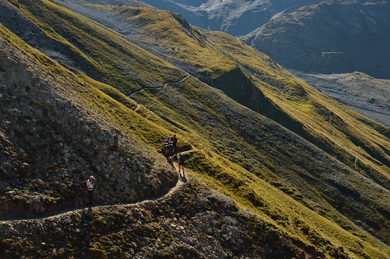 Si parte dal Rifugio Campo (m. 2000) seguendo le indicazioni per la Baita del Pastore, lasciandoci alle spalle verdi prati adibiti al pascolo e le ultime baite caratteristiche della Val Zebru'. Giunti alla Baita (punto acqua con area picnic) il sentiero si dirama. Dirigendosi a sinistra, la strada prosegue verso il Rifugio Quinto Alpini (m. 2877), storico rifugio del Cai Milano. Situato su uno sperone di roccia alle pendici del ghiacciaio dello Zebru', il rifugio e' meta e base d'appoggio per escursionisti, alpinisti e punto di accoglienza del Sentiero Italia. Dirigendosi invece a destra e seguendo i cartelli che indicano il Passo Zebru' si sale dolcemente lungo il sentiero che, attraversando numerosi ruscelli, abbandona i verdi prati per un paesaggio piu' brullo e sassoso. Un breve tratto di gradoni rocciosi si supera con l'aiuto di corde metalliche per proseguire poi su sentiero meno pendente, che puo' presentarsi innevato anche per una parte della stagione estiva. Giunti al Passo Zebru' (m. 3010), il panorama si estende dal Gran Zebru' (m. 3857) al ghiacciaio dei Forni fino alle Tredici cime. Si prosegue in discesa verso la Val Cedec; prima in direzione del Rifugio Pizzini (m. 2.706) e poi attraversando il torrente lungo il sentiero che in leggera discesa porta al Rifugio Branca (m. 2493).
