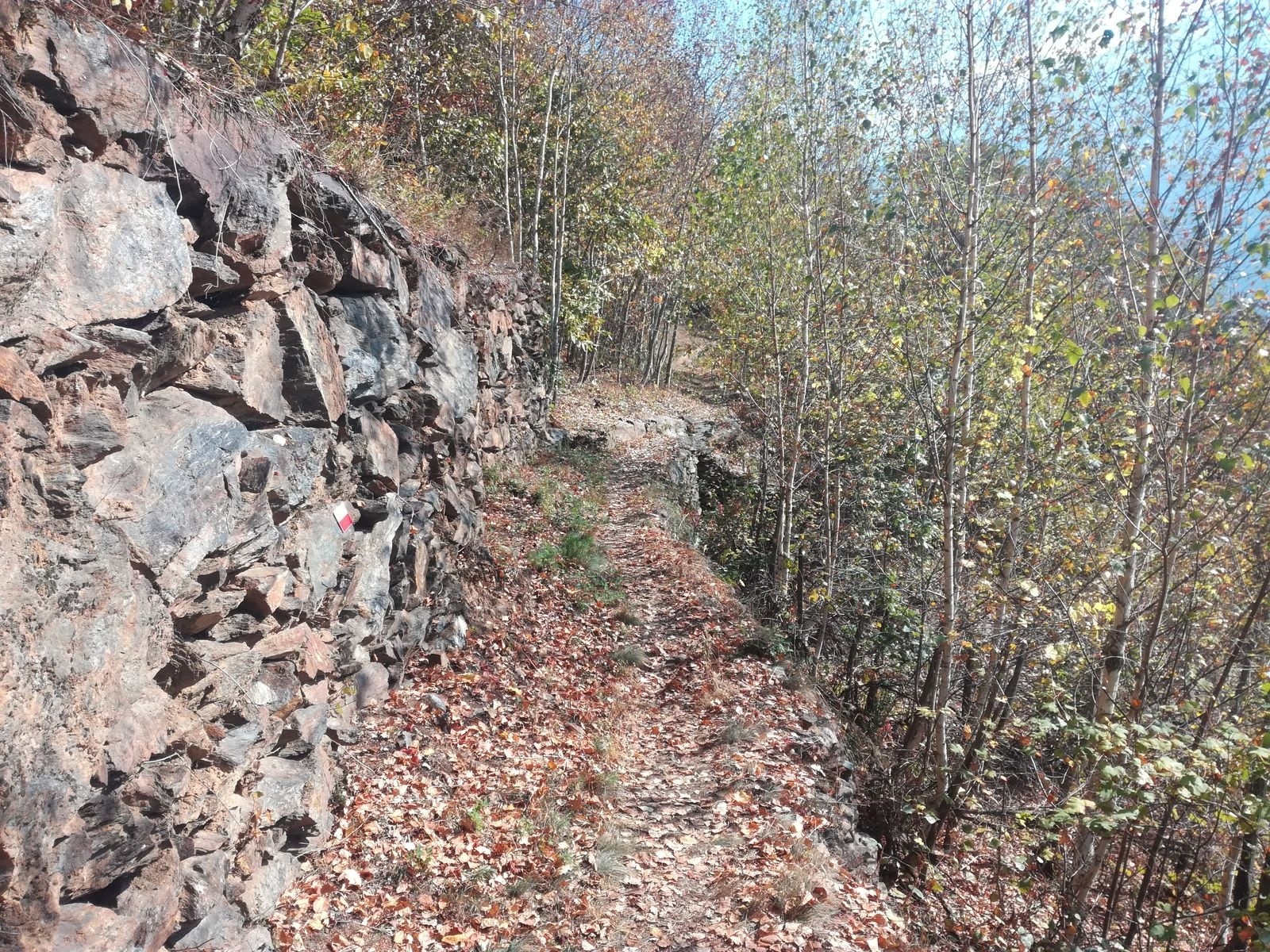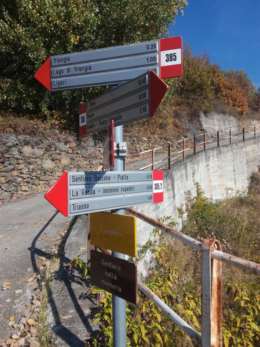 L'itinerario proposto e' un percorso ad anello che permette di ammirare i vigneti valtellinesi da una diversa prospettiva. E' un percorso consigliato anche per famiglie, dato il poco dislivello da affrontare. Si puo' percorrere tutto l'anno ma, ovviamente data la sua forte esposizione al sole, e' consigliabile soprattutto in inverno dove altri itinerari non sono percorribili. Si parte dalla Loc. Piatta ed in poco tempo si raggiunge, nel punto piu' alto dell'itinerario proposto, il Masso Altare (e' un grande masso erratico a forma di parallelepipedo irregolare la cui faccia superiore, incisa con coppelle e canaletti, e' inclinata verso nord), testimonianza storica che divide territorialmente i Comuni di Sondrio e Castione Andevenno. Da questo punto si scende da un sentiero, prima, e una trattorabile, poi, fino alla loc. Pradella. Da qui ha inizio il sentiero Balcone. Il sentiero Balcone e' il fiore all'occhiello di questo percorso; si tratta di un collegamento escursionistico tra i vigneti ad una quota di circa 700 m. recentemente ripristinato (nel 2016) nell'ambito dell'azione Cantieri in Quota. Tornati in loc. Piatta svoltiamo verso sinistra e ci portiamo in loc. Ca' Martinelli da cui si percorre un tratto dell'itinerario ''dei ricordi e delle fatiche'' da cui ci si riporta sulla strada asfaltata per Triangia e quindi a loc. Piatta