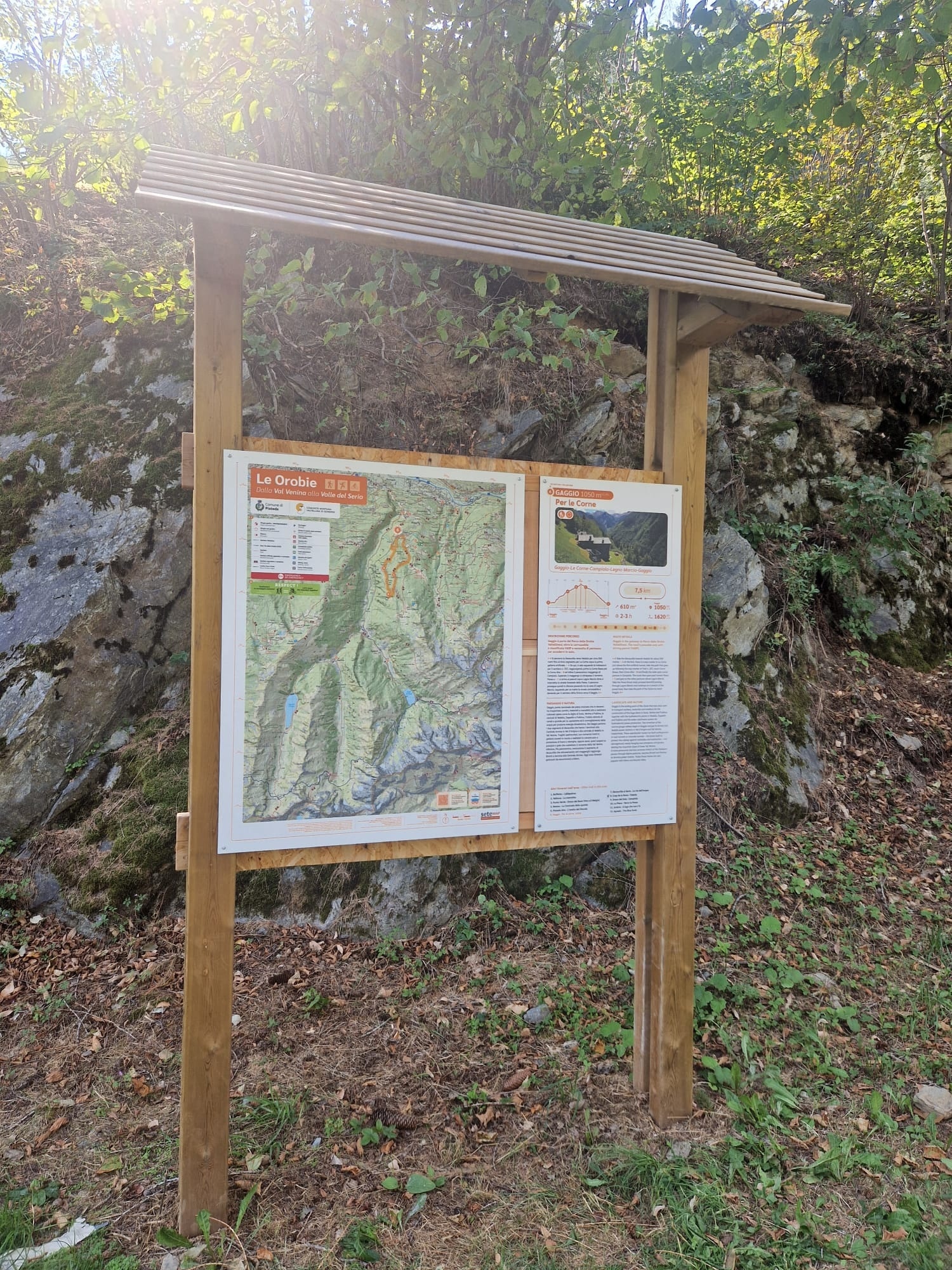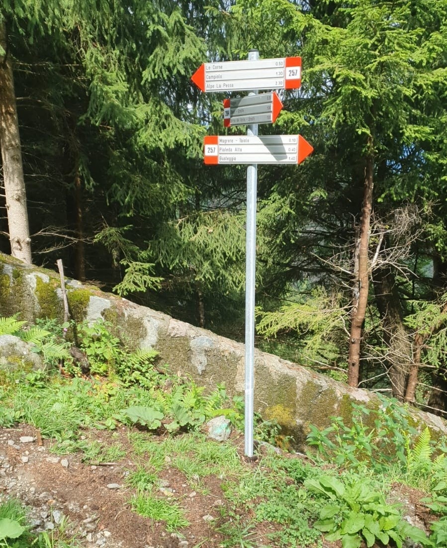 Si percorre la Decauville verso Vedello per circa 500 metri fino al bivio segnalato per Le Corne sopra la prima galleria artificiale. Da qui, si sale seguendo le indicazioni per il sentiero n. 257, raggiungendo prima la Corna Bassa, poi la Corna Alta ed infine il panoramico maggengo di Campiolo. Superato il maggengo si oltrepassa il torrente Pessa e si arriva ai pascoli sopra Legno Marcio dove si intercetta la strada forestale della Pessa. Il percorso prosegue quindi in discesa passando tra le case di Legno Marcio, seguendo per un tratto la strada carrozzabile e deviando per il sentiero della Sciu'ca verso il Gaggio.