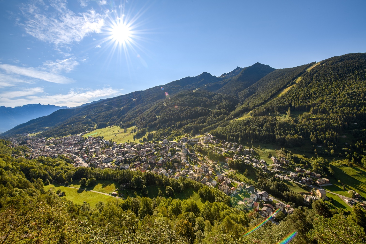 A est la mole del gruppo dell’Adamello con la cima del monte Baitone chiude questo incredibile panorama. Il sentiero continua salendo nel bosco fino a raggiungere il monte Belvedere, facilmente individuabile dalla presenza di alcune antenne ben visibili. Nell’ultimo tratto del sentiero la vista sulla Valtellina e la zona di Teglio, Bianzone e Villa di Tirano sono davvero spettacolari.