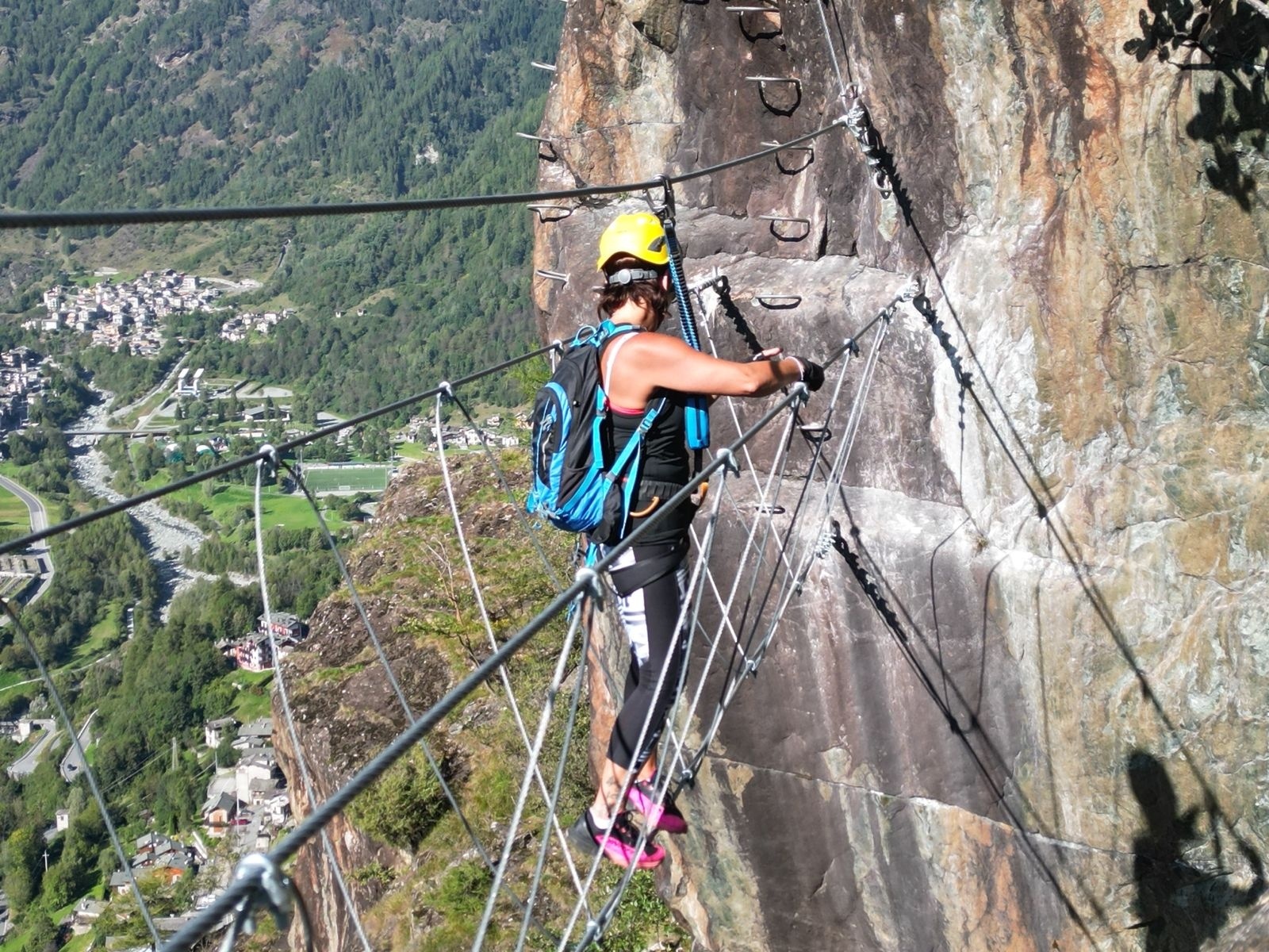 Al suo termine la ferrata obliqua a sinistra (nord) e con facili balze conduce al breve ma bellissimo ponte tibetano. Il ponte è lungo circa 12 metri e termina con un breve muro verticale e molto aereo che si deve salire verticale per un paio di metri per poi aggirarlo a sinistra su un bellissimo ed aereo spigolo (meraviglioso sfondo su l’abitato di Chiesa Valmalenco e la valle di San Giuseppe). Superato questo spigolo lungo una decina di metri si giunge ad una comoda cengia. Per chi volesse evitare il ponte tibetano c'è un tratto di via ferrata che lo aggira continuando a destra sulla cengia per un percorso facile ed appoggiato.